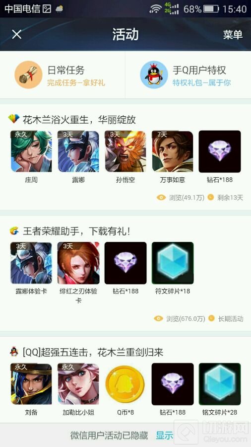 进去底下有四个大模块,到发现模块的活动部分,经常有比赛报名啊比赛完成奖励之类的,还有就是第二张图右上角手q用户特权,每天可以领好多钻石和铭文碎片。