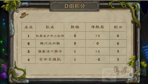 经过前几轮的比赛,四支队伍的战绩均为1胜1负,接下来的比赛将决定最后的出线名额。第一回合,“犯罪高手”的萨满祭司面对“日不日”的法师,败在一套华丽的法术之下,最终“日不日”成功施展了无限火球术拿下了这局。第二回合“日不日”的猎人在开局卡手的情况下,无法对“犯罪高手”的德鲁伊造成威胁,被扳回一局。第三回合是一场猎人内战,“犯罪高手”更胜一筹拿下了比赛。第四回合,双方你来我往一直到打空牌库,最终“日不日”组合的圣骑士先输于疲劳,“犯罪高手”赢得了这场比赛,也顺利晋级。