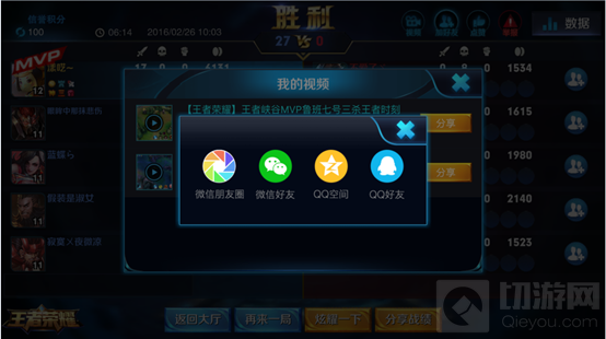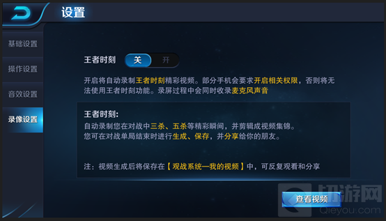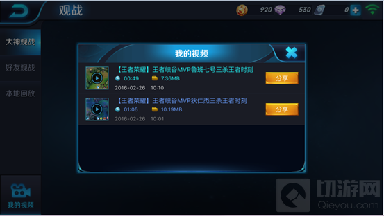 在观战界面中增加了我的视频按钮,点击之后将会展示您本地存储的王者时刻的视频,您可以在这里对视频进行管理、上传和分享。