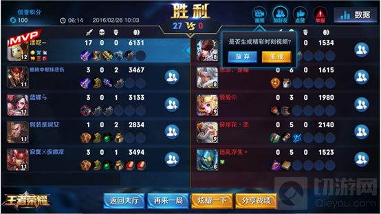 王者时刻功能开启以后,在每一场对战结束后,将在结算界面询问您是否生成王者时刻视频