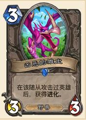 凶恶的雏龙是勇闯安戈洛扩展包中最具特色的一张卡牌,这张广大玩家称为“无解肥“的卡牌拥有着非常强的属性,一旦该随从攻击过英雄即可获得进化,一旦这张卡牌登场而你的对手又在下一个回合无法解决掉它,那么这张卡牌就很有可能变成风怒+潜行+亡语+高攻击+……在3费随从中凶恶的雏龙已经成为高质量的代表,在竞技场中也成为了广大玩家最喜爱的卡牌之一。