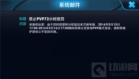 对于在游戏中信誉积分较低的用户,我们将对这一部分用户进行惩罚。将于2016年5月13日17:00-2016年5月16日17:00(共计72小时)禁止参加PVP模式竞技。