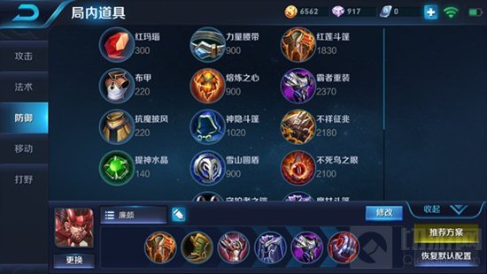六神装:红莲斗篷,影忍之足,反伤刺甲,魔女斗篷,霸者重装,血魔之怒。