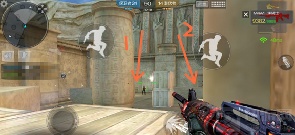 这个点位可以优先看到一号位出来的敌人,由于这个点位很容易被对面穿死,所以必须左右移动着泼射敌人。这里建议拿M4或者AN94系列的武器,AK系列9999发子弹的泼射弹道特别不稳定,这么远的距离一般玩家还是不要拿AK在这里作死了(高手请无视这句话)。2号位的敌人,在正常情况下队友会帮你打掉,不过凡事无绝对,队友没有打这里的话,那么我们就求人不如求己,需要自行解决啦!