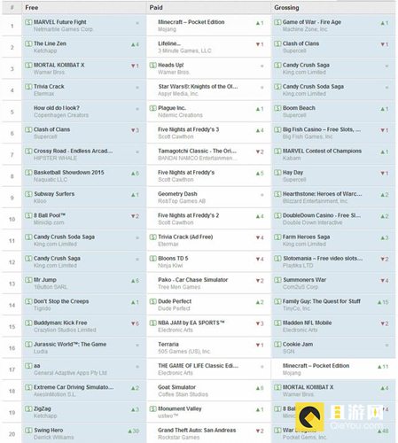 Kabam公司的《漫威格斗冠军》(MARVEL Contest of Champions)本周再进一步,超越了之前排在它前面的《卡通农场》,上升到了第七名。暴雪公司的《炉石传说:魔兽英雄传》也在不断取得进步,由上周的第十二名上升至本周的第九名。《拉斯维加斯赌场》(DoubleDown Casino)则继续守在第十名的位置上,《农场英雄传奇》同样也上升了三个排名,来到了第十一名。