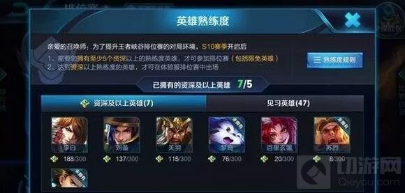 上图就是王者荣耀中的熟练度查看界面,上面明确提出:S10赛季,必须拥有5个资深以上的熟练度英雄,才能参与排位,同时排位也不允许资深熟练度以下的英雄参与。当然这个资深熟练度比较简单,随随便便打几把就够了,不过这样强制限制,可以避免玩家在排位中练习新买英雄。