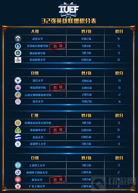 《英雄联盟》比赛中,重庆科技学院、重庆邮电大学和武汉体育学院三支对于以全胜战绩强势晋级,其中B组的重庆科技学院打野位选手iLu1表现抢眼,多次拿下MVP;D组的上海理工大学和集美大学展开了白热化对决,虽然上海理工MoHu单场拿下5杀,但是最终没有把握住机会,被发挥更稳当的集美大学淘汰。