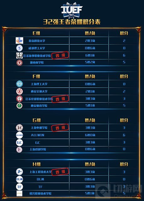 《王者荣耀》比赛中,B组杭州电子科技大学在小组赛展示了强大的实力,以6胜0负的全胜战绩晋级8强; C组上海复旦大学在最后一场与华中科技大学的比赛中,以微弱的优势赢下比赛;E组在正常轮次比赛中出现同分,江苏海事职业技术学院在重压之下通过加赛战胜了湖南商学院,获得最后一个晋级名额。