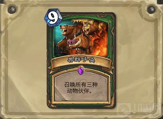 9费,效果:召唤所有三种动物伙伴。职业:猎人。出处:上古之神。品质:史诗,又称吉祥三宝,上古之神版本的猎人又叫“活到8费就胜利”,8,9费吉祥三宝二连,任何职业都招架不住,直到后来暴雪从8费削弱到9费。有冲锋有嘲讽有BUFF,三位伙伴配合默契,能斩杀能护脸能站场,让躲在一旁的暴龙王默默坐实了冷板凳,适合卡组:中速猎