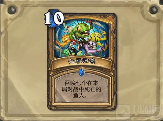 10费,效果:召唤七个在本局对战中死亡的鱼人。职业:圣骑士。出处:探险者协会。品质:稀有,10费容易卡手,还需要前期的铺垫送鱼人,对卡组有一定的要求,但这并不妨碍王者归来爆炸效果。第一波王者归来并不可怕,大多数只是解场耗血,可怕的是第二波,蓝鱼人加鱼人领主加老瞎眼的组合最高能够达到40~50左右的斩杀,适合卡组:死鱼骑