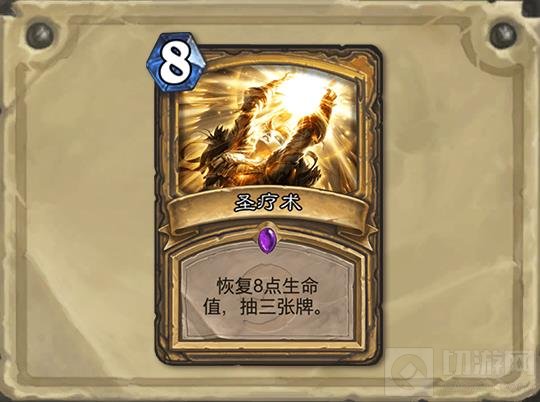 8费,效果:恢复8点生命值,抽3张牌。职业:圣骑士。出处:经典。品质:史诗,8点恢复能够及时让自身血量脱离危险,3张过牌让打空手牌的圣骑士恢复战斗力,非常实用的卡牌,适合卡组:奶骑