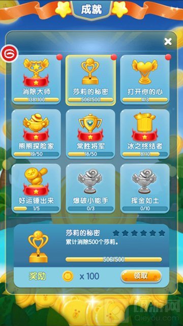 新版本《小熊爱消除》新增了成就系统,游戏将记录下玩家的成绩,比如消除特定数量的动物,通过一定数量的关卡, 都会获得相应的成就,获得金币、爱心、钻石等等丰厚的奖励。