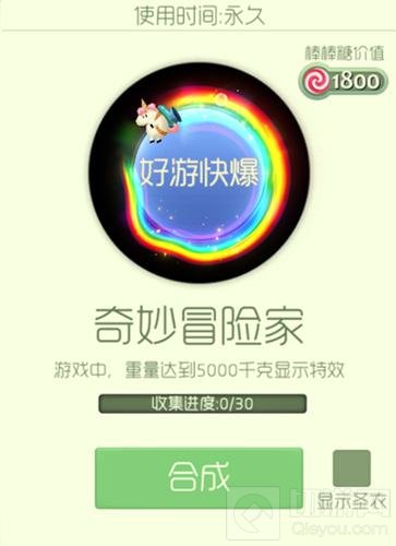 奇妙冒险家是一款非常亮丽的光环,在球球周围有一匹小独角兽,围绕着球球奔跑,同时在身后有一条彩虹绸带,刚好绕着球球一圈,非常亮丽。