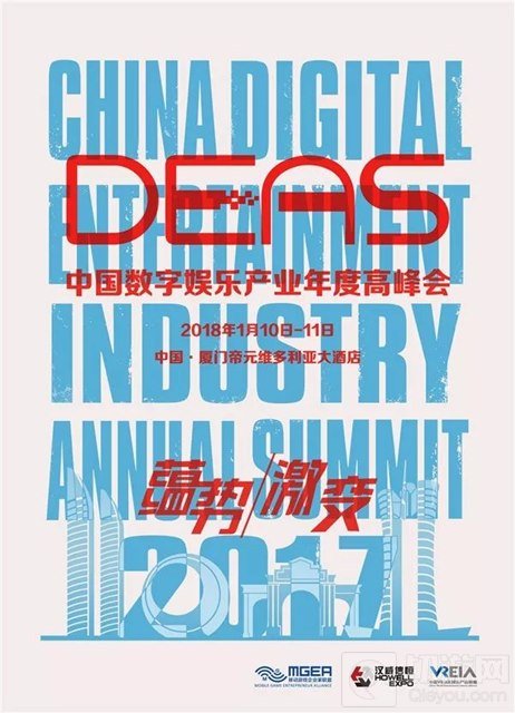 在厦门市人民政府的指导下,由移动游戏企业家联盟(MGEA)、厦门市思明区人民政府主办,上海汉威信恒展览有限公司、中国VR/AR娱乐产业联盟(VREIA)联合主办,厦门市文化改革发展工作领导小组办公室、厦门市经济和信息化局及厦门市思明区科信局大力支持的2017中国数字娱乐产业年度高峰会(DEAS)将于2018年1月10日至11日在厦门帝元维多利亚大酒店隆重举办。