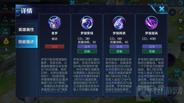 梦奇将自己的噩梦朝指定位置传输,并在该位置制造一个不断变大的漩涡,可持续对范围内的敌人造成法术伤害与减速效果,传输完成或期间内主动施法,梦奇会位移到漩涡中心,继承已输出噩梦的同时,还能造成法术伤害与击飞效果,若施法过程中被打断,则不会进行位移,同时将损失已传输的噩梦,并且该技能将进入冷却状态,梦奇需要有充足的质量才能使用该技能。被动:梦奇释放的噩梦在伤害敌人的同时,会降低受术者的法术攻击(该效果可以叠加)。