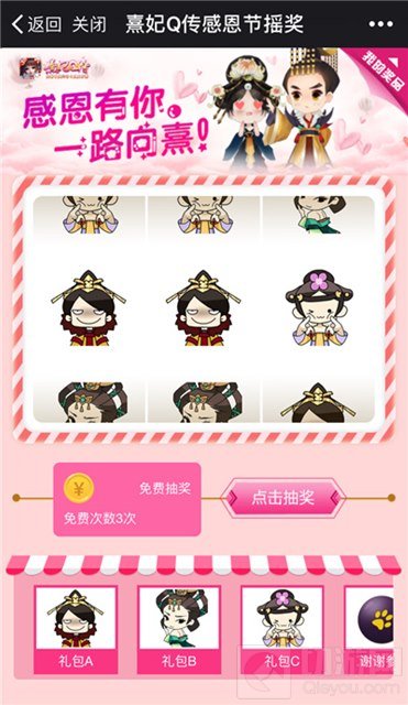 为了回馈广大小主的喜爱,从即日起至11月28日,关注“熹妃Q传”微信公众号的小主,只需点击底部菜单栏“凤仪公测”—“疯狂摇奖机”,即可开启活动!每位小主每天将得到3次免费摇奖机会,当摇奖机停止时三个图案相同即可获得《熹妃Q传》感恩节大礼包!礼包分为A、B、C三种类型,魅力值鲜花、紫色材料大量掉落,赶紧来看看这个冬天谁是欧气小主吧!