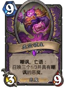 目前标准卡组术士主要分两类,动物园和控制术,动物园是铺场的体系,这张随从卡明显偏控制而不是战场所以不可能加入构筑。而控制术中,9费可以优于这张随从的卡很多,如果是为了控场,3点攻击完全没有起到效果,不如一张8费扭曲虚空。再高费一点不如一张10费末日降临。