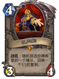 2、巴内斯:巴内斯至少是4费4-5的身材,而且上限相当的高,拉出巫妖王、深蓝刃鳞龙人还有凯恩血蹄都是血赚。运气稍微差一些拉出冲锋随从,比如火车王,南海船工,海盗帕奇斯或者是一些功能性的随从,比如收集者沙库尔、南海船长、焦油爬行者都能对场面有所帮助。剩下的情况你就把他当成一个4-5的冰风雪人,但是值得一提的是也可以用暗影步回手拉出来的强力生物(军情七处特工、邪脊吞噬者、艾德温·范克里夫)
