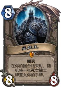 3、巫妖王:巫妖王除了配合巴内斯以外,本身也是一个8费强力占场,我最初的版本这个卡位选择的是毒心者夏克里尔,这个版本我选择了巫妖王。老实说我觉得这两张卡都不错,而且各有优劣。巫妖王被巴内斯拉出来更赚一些,但是很多时候你根本活不到8费。巫妖王的身材很不错,不是很好解,但是毒心者夏克里尔3-2的身材就显得有些差了。