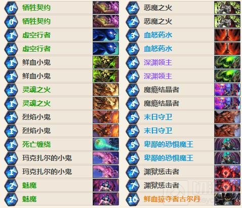 这是一套节奏卡组,带上了大量身材超模但有负面效果的随从,其中最典型的就是 深渊领主。平心而论,深渊领主身材相当超模还是恶魔,负面效果又在偏快攻卡组接受的范围之内,之前出场率不高的主要原因就是太贵了,是紫卡。但是平心而论,在不少对局中他完全能起到类似大范的作用,要是再配合恶魔之火或者血怒药水能给对手相当大的前中期压力。由于随从基本都是 恶魔,我们带上了很多针对恶魔的 buff,在中期能构架出相当优质的场面。