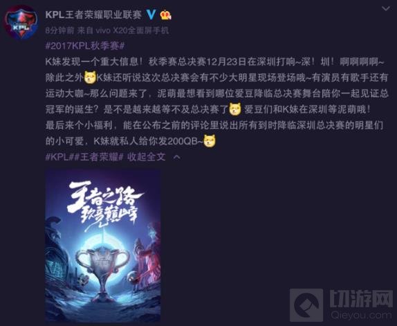 话说,最近几天频繁进出王者峡谷的好汉们,肯定有看到游戏里更新的一个信息。官方在微博上也宣布了一波,没错,KPL秋季总决赛的时间和地点都已经定下来了,12月23日,会在深圳春茧体育馆举行。