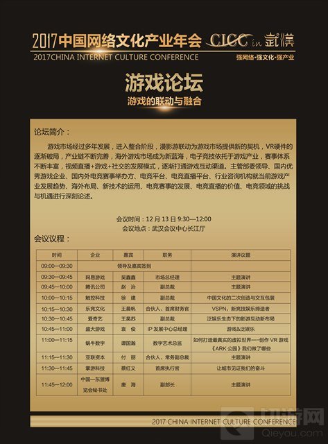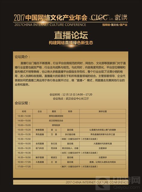 经年会主办方确认,以“强网络,强文化,强产业”为主题的2017中国网络文化产业年会议程于今日正式公开,现将论坛详细议程公布如下,让大家一睹为快: