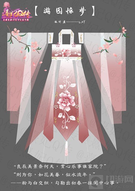 一曲《牡丹亭》是穿梭百年的慨叹,“良辰美景奈何天,赏心乐事谁家院?则为你如花美眷、似水流年。”@林逍云 小主所设计的“游园惊梦”粉白交织,大朵牡丹镶嵌于逶迤拖地的粉色裙摆之上,更用金银丝线点缀颈间袖口,勾勒出少女一抹闺中心事。