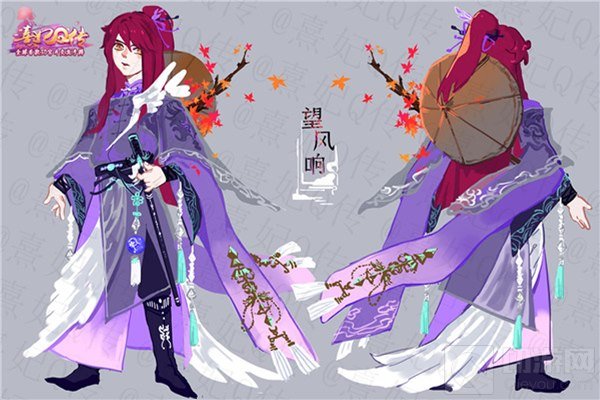 @水漫荔湾 小主所设计的“风雪阑珊”颜色鲜明跳脱,格外引人注目。女装“听雪色”少女心满满,透明纱裙外搭蓝白披肩,更别出心裁地设计了两条紫金飘带垂于后背,亮粉发色和舞鞋搭配得恰到好处。男装“望风响”与女装的颜色大相径庭却又在细节处交相呼应,玄色衣袍勾勒大将气息,酒红色的发型又让人感受到满满活力,侠之大者风流俊逸。