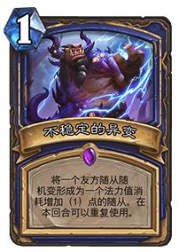 我十分喜欢不稳定异变这张牌,这张牌会把我的欧洲血统发挥的淋漓尽致(手动滑稽),非洲小伙伴就不要幻想了,新版本出了这么多的1/1随从就是为你们准备的(破案了)。我觉得把不稳定异变加入图腾萨是一个不错的选择,可以把没有攻击性的图腾进化成大表哥,这可以在一定程度上缓解满地图腾场攻却高达一点的尴尬。