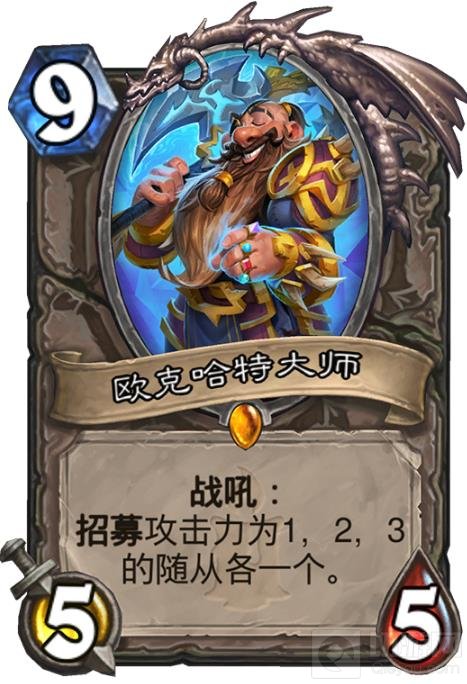 例如“欧克哈特大师”这张中立橙卡,其战吼效果为招募攻击力为1,2,3的随从各一个,乍一看这张卡牌平平无奇,但是如果这张卡牌配合战士的焦油兽王、兽人铸甲师以及恐角龙宝宝的话,就可以实现在9费召唤出3个高质量生物的场景!