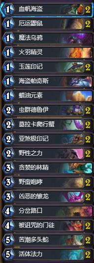 1费1/3身材的野兽和1费0/2嘲讽圣盾。可以说魔法乌鸦都可以让出卡位。必须满编,这里火羽精灵只带了一张,因为火羽好处是补充手牌,缺点是身材已经被很多1费随从所代替!