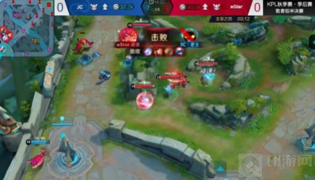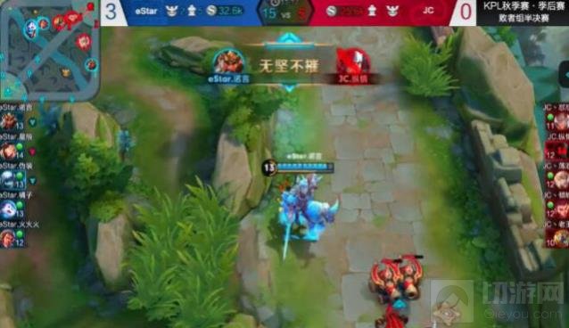 开局JC拿到一血,但诺言关羽抢四成功果断开团,帮助伪装扁鹊拿到双杀。之后双方不断在下方野区展开撕扯,此后诺言的关羽犹如天神下凡,依靠自己的高机动性带动中路野区不断击杀JC众人,在10分钟已经获取6000的经济优势,并拿到JC上路高地!最后一波,诺言关羽再度推到四人,一波1换4成功终结比赛!恭喜eStar!