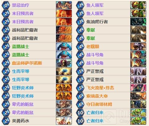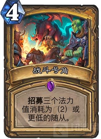战斗号角:这是新版骑士的明星单卡,为了能超模2费,我满编了脏鼠、末日、战利品、血法,加上原本的炎术师、蓝腮,一共11张2费怪,没有带任何1费怪,这样除非第2张号角来得特别晚,否则多半能拉满3张。拉出脏鼠末日可以清场并配合严正警戒过牌;拉出战利品血法可以过牌;手上只有生平时,拉出炎术师可以配合清场。