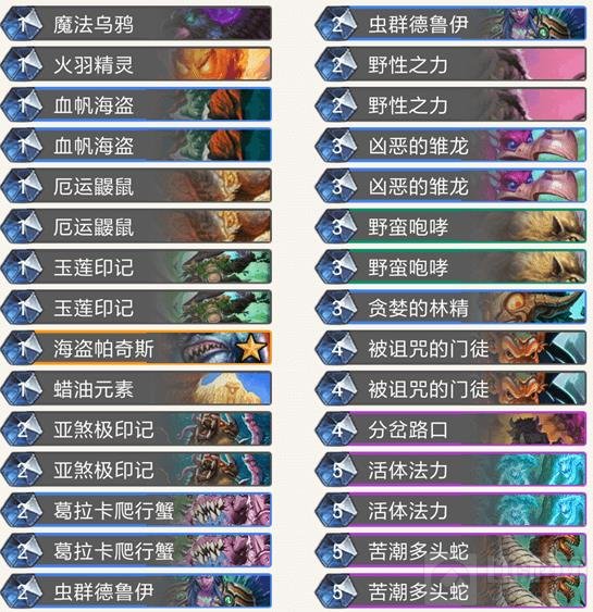 1费1/3身材的野兽和1费0/2嘲讽圣盾。可以说魔法乌鸦都可以让出卡位。必须满编,这里火羽精灵只带了一张,因为火羽好处是补充手牌,缺点是身材已经被很多1费随从所代替!