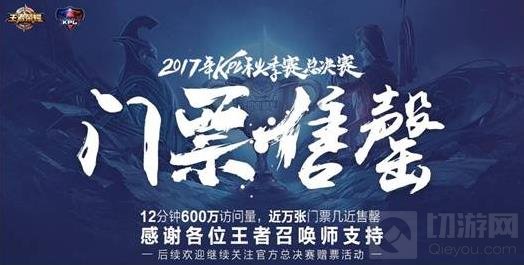 2017年KPL秋季赛总决赛门票于今天中午12:00开始正式售卖后,召唤师们全军出击,同时在线抢票的人数高达600万人,近万张门票在12分钟内售罄。