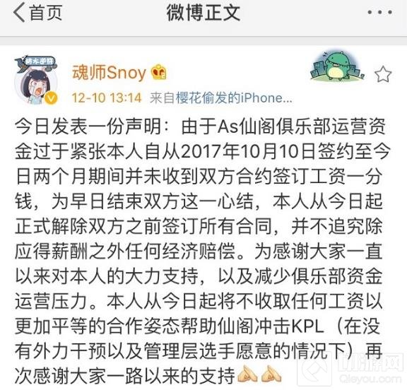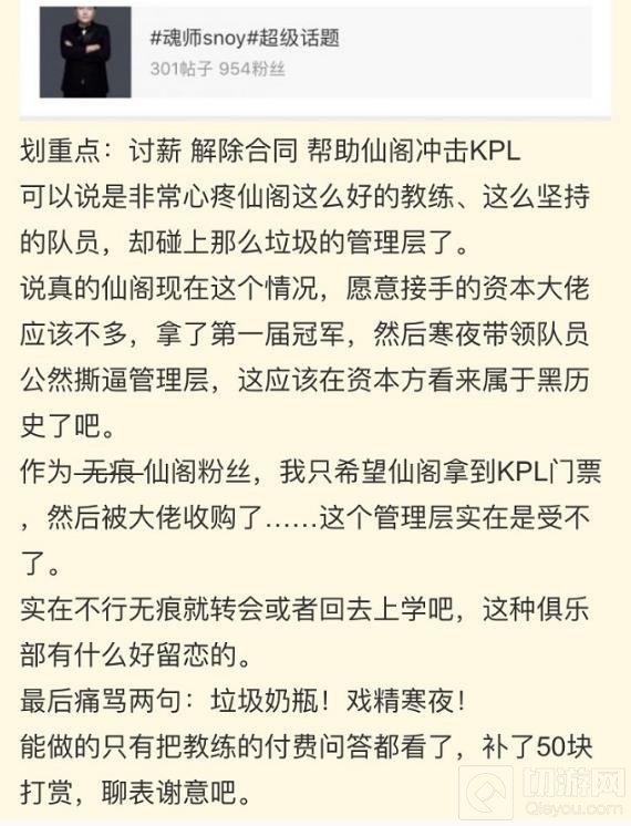 2017年注定是仙阁忧伤的一年,从开年的管理层与队员互撕,到春季赛的高开低走,再到王者荣耀KPL秋季赛降级,总结出来就是今年的他们一直在走下坡路,很难想象这样的事发生在一支冠军队伍身上,近日仙阁教练魂师又发微博表示:仙阁已拖欠他工资两月有余,正式解约,不收取任何工资以更加平等的合作姿态帮助仙阁冲击KPL(在选手和管理层都同意情况下)。