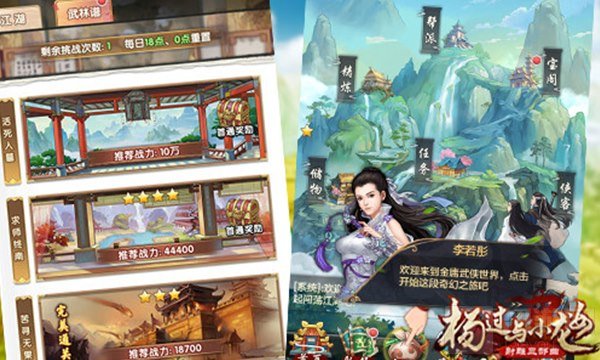 《杨过与小龙女》是一款竖版武侠手游,将金庸经典《射雕英雄传》《神雕侠侣》《倚天屠龙记》搬上游戏屏幕,带玩家重忆金庸主角的侠骨柔情与爱恨情仇。 拥有江湖冒险、拼酒拜师、华山论剑、据守襄阳等玩法,将少林寺、绝情谷、桃花岛、峨眉山、光明顶等经典场景一一复刻,配合2D骨骼动画技术应用,让游戏战斗技能更加绚流畅,只为带你走一遭恩怨情仇、红尘纠葛的射雕江湖路!