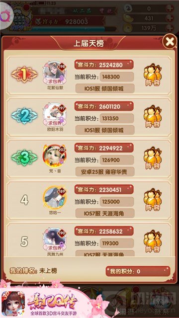 未能进入名人堂的小主也不必介怀,第一次的失败只不过是成功的垫脚石而已,打开右上方的“上届天榜”,即可看到排名前100小主的积分情况、阵容分布、装备搭配,从他们积累的强大战斗力中吸取经验,整肃自身,厉兵秣马再出发!
