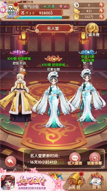 打开《熹妃Q传》跨服PVP排位赛的名人堂,赫然可见位列三甲的小主芳姿,IOS1服“花絮仙默”小主高中状元,IOS1服“欧阳木羽”小主荣登榜眼,安卓25服“梵丶音”小主喜夺探花!玩家弹幕中,不仅有满满的对这三位小主的崇敬和祝福,更有调皮的吐槽:“右边两位娘娘撞衫啦!”能在千军万马中杀出一条血路,想必三位小主都有自己过人的布阵经验和超强的战斗实力,小主们赶紧去勾搭这几位大神取取经吧!
