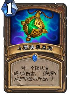 小型法术玉石:非常容易升级,升级后1费打四,配合横扫可以清除对方场面上的威胁,就算不升级,在面对快攻时,前期打出或补刀都有极其出色的效果。