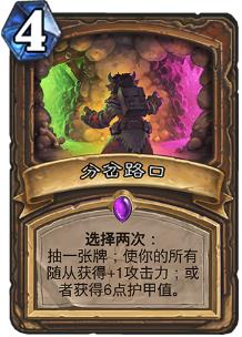 分叉路口:苟。。。全性命于乱世,不求闻达于诸侯,活下去才能走向胜利。一般选择4费12甲,同时还可以选择过牌或者加攻,灵动而实用,特别说明:卡牌描述选择两次,不能配合鹿盔,不然这太Imba了。