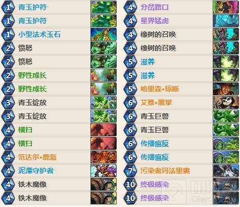 新卡中受益最大的就是德鲁伊、猎人、术士。而德鲁伊的新卡,则改变了传统青玉德的打法与思路。曾经的青玉德除了在面对快攻时起手会选择留末日 愤怒内战可能留爱雅黑掌外,全留科技,无脑跳费,在跳费的过程中自身非常脆弱,极其容易被压制血线 压制场面,当费用起来时也容易因为前期青玉身材小或没有抽到终极感染导致崩盘,而以下新卡则完全解决了这个问题。