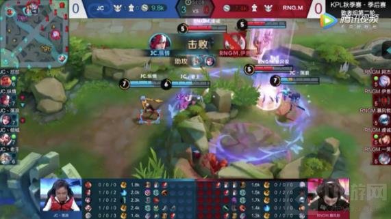 JC对阵RNG.M的败者组第二轮比赛第一局拿出姜子牙体系,在比赛进行到4分08秒时,JC姜子牙、貂蝉和韩信三人凭借队伍人头和经济上的双重优势来到RNG.M野区红BUFF处进行反蹲,就在RNG.M达摩和马可波罗想将红BUFF拿下时,JC貂蝉先手入场干扰两人,姜子牙从左侧草丛出来释放一、二技能限制达摩的移速,此时韩信迅速切入成功反到红BUFF并配合姜子牙的大招击杀达摩。JC姜子牙配合韩信在草丛埋伏敌人进行击杀的套路不止拿出过一次,却每次都打出了优异的效果。