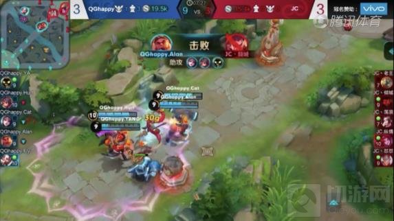 QGhappy对阵JC的胜者组决赛决胜局当中,QGhappy在拿出苏烈打野之后又拿出太乙真人作为辅助,这两位英雄一个能在队友的帮助下进行复活,一个能帮助队友进行复活并且都带有控制技能。在比赛进行到第7分16秒时,苏烈和太乙真人见JC不知火舞还没有上线直接带领队伍越塔强杀JC聚集在中路的四人,JC哪吒在被苏烈的大招击飞后又遭受到了苏烈猛烈的普攻最先丧命,JC的中路一塔也丢失,随后太乙真人和苏烈不断利用自身控制限制敌方突进英雄的进场,配合队友将JC打出团灭。