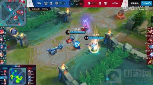 XQ在与eStar的比赛前期遇到了十分大的困难,无论从两条边路直接的对抗,还是直接针对野区的BP,都收效甚微,最终XQ更快速的找到了突破口,那就是射手打野发育再快,在前期也属于发育型打野,无法过多的去把时间花费在GANK上,而XQ正是抓住这点选择了偏节奏型的打野,在前期就联合中野辅寻找突破,通过比赛直播当中的热点图我们可以发现XQ将重心放在中路,首先切断了eStar中路的支援,降低两条边路初期被GANK的压力,其次通过频繁的GANK每次在中路取得优势之后,立即入侵野区拿到优势。