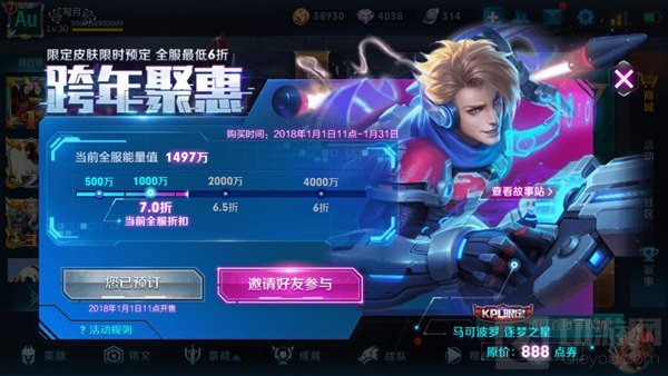 3、预定成功还能为KPL总决赛添加能量值(10-100不等),全服的能量值越高,全服折扣就越低,最低可到6折!