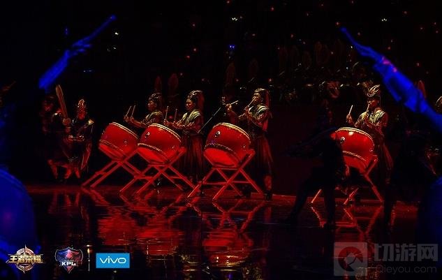 世继交峰明星表演赛后,配合着震天的战鼓声,数名黑衣人依次出现,整个舞台模拟出王者峡谷的战场与战况,以兵为营,伴随着动人心魄的鼓点,敲击出的背景音乐,瞬间将现场的移动电竞观众代入王者峡谷,感受那一触即发的紧张感和厮杀感。而本次总决赛的舞台在地屏动效呈现与战事音效上做了进一步的提升,每次主宰出现在王者峡谷或团战爆发,主舞台地屏会对应出现动态演绎过程,让移动电竞赛事更具观赏性,让在场的王者召唤师们大呼惊艳。