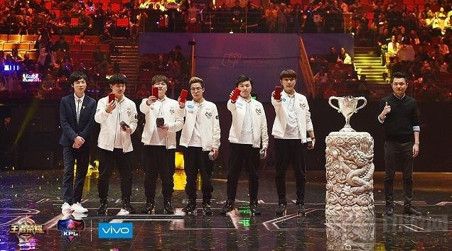 随后腾讯集团副总裁、腾讯影业首席执行官程武、腾讯互动娱乐天美L1工作室总经理《王者荣耀》制作人李旻分别为冠军队伍颁发,由KPL总决赛冠军戒指合作伙伴六福珠宝提供的象征最高荣耀的总冠军戒指以及vivo为冠军队伍定制的vivo X20冠军纪念版,腾讯互动娱乐天美工作室群副总裁纪泽锋颁发全场MVP。