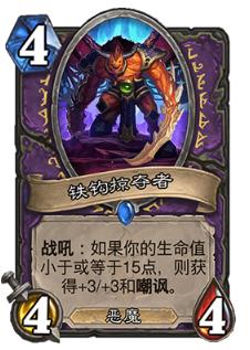 铁钩劫掠者:这张牌大多见于动物园的构筑之中,版本初期也有人将他用在控制术里,但是效果都不理想。先说最常见的动物园构筑,这张卡很难477准时拍上去,因为那时术士自己还没怎么撮,除非被对面打的很凶,但是这不意味着术士自己没有站住场面吗?