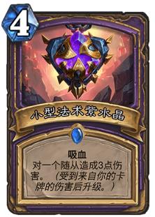 小型法术紫宝石:非常强力的一张卡牌,我心中狗头人版本的第二宝石,4费打5其实已经非常强了,更不要提4费打7的终极版本。 大多数时候是不需要特意养宝石的,使用起来相对比较灵活,而且极大弥补了术士在标准的短板,可以说是雪中送炭的一张牌,即使是狂野的术士我都非常犹豫是否要携带一张。